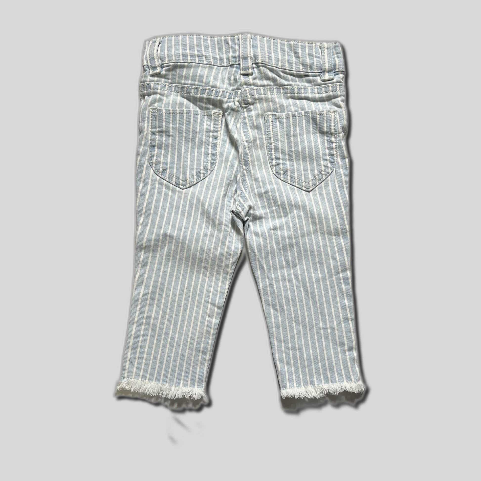 Pantaloni denim albaștri cu dungi, un must-have vesel și modern. Acești pantaloni denim, cu un design adorabil în dungi albe și albastre, aduc un strop de prospețime în garderoba copilului tău. Perfecti pentru joacă sau plimbări, acești pantaloni sunt confecționați pentru a oferi confort și libertate de mișcare. Detaliile franjurate de la baza pantalonilor adaugă un aer jucăuș și la modă. Sunt ușor de asortat cu diverse bluze și tricouri, creând ținute adorabile pentru cel mic.