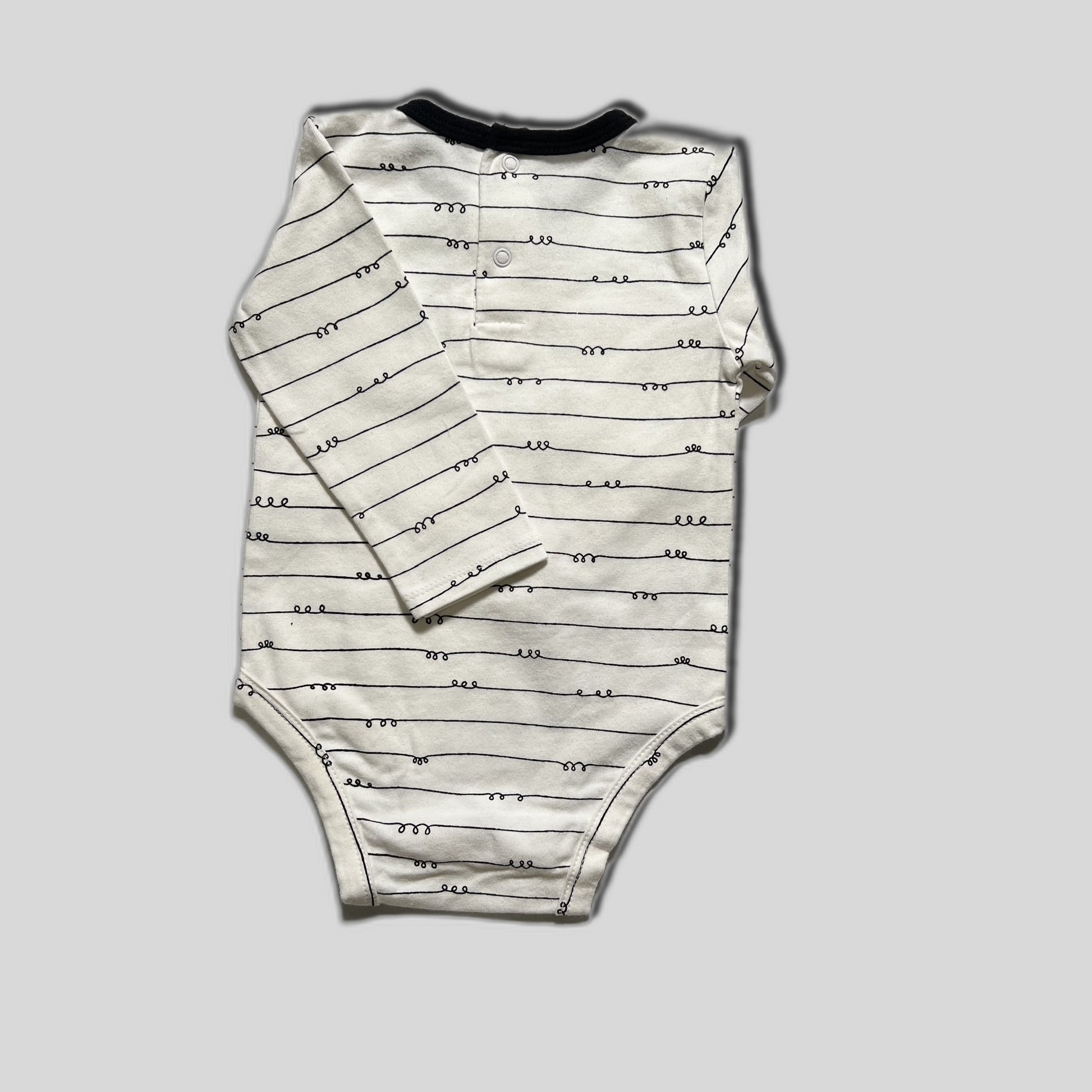 Body alb cu dungi jucăușe, un must-have adorabil pentru prichindei. Acest body este confecționat dintr-un material moale, ideal pentru pielea sensibilă a celui mic, asigurând confort pe tot parcursul zilei. Dungile negre, împreună cu micile spirale, adaugă un plus de originalitate, transformând un articol vestimentar simplu într-unul plin de personalitate. Un buzunar negru aplicat pe piept completează designul, oferind un aer chic și modern. Sistemul de închidere cu capse facilitează îmbrăcarea și schimbarea rapidă a bebelușului, un detaliu apreciat de orice mămică ocupată.