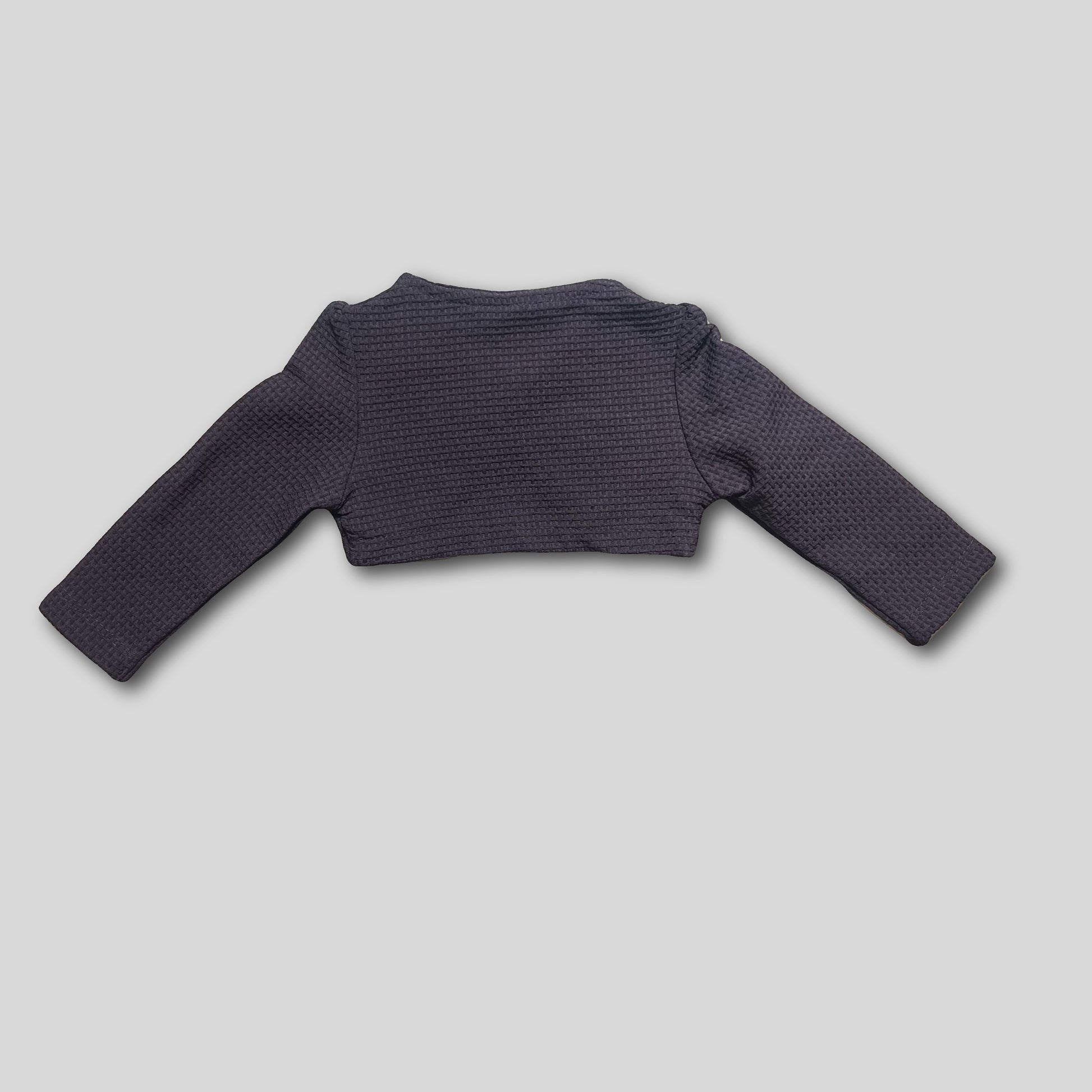 Bolero elegant bleumarin pentru fetițe cochete și stilate. Acest bolero adorabil, într-o nuanță profundă de bleumarin, adaugă un plus de eleganță oricărei ținute pentru copilul tău. Textura sa subtilă oferă un aspect sofisticat, iar detaliul cu fundiță roșie și pietricele strălucitoare aduce un strop de culoare și veselie. Se încheie cu un nasture auriu, perfect pentru a completa o rochiță de ocazie sau chiar o ținută casual chic.