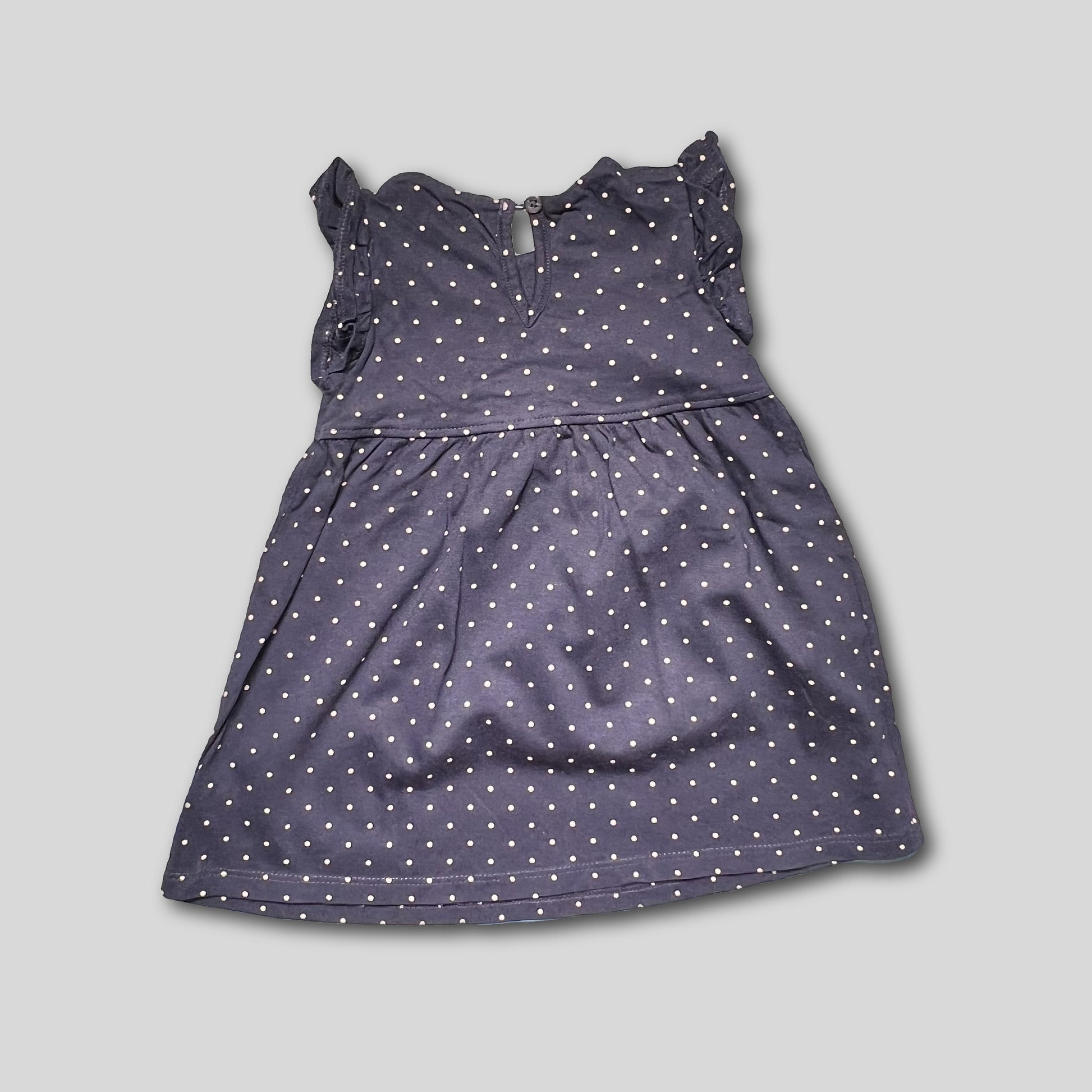 Rochie Bumbac Fetițe Bleumarin Buline Albe, Chic și Veselă. Această rochiță adorabilă, într-o nuanță bleumarin elegantă, este acoperită cu buline albe jucăușe, perfectă pentru zilele însorite ale copilului tău. Are un design simplu, dar fermecător, cu mânecuțe scurte cu volane care adaugă un plus de stil. Materialul este moale și confortabil, ideal pentru pielea sensibilă a celor mici. Se încheie cu un nasture la spate, facilitând îmbrăcarea rapidă și ușoară.