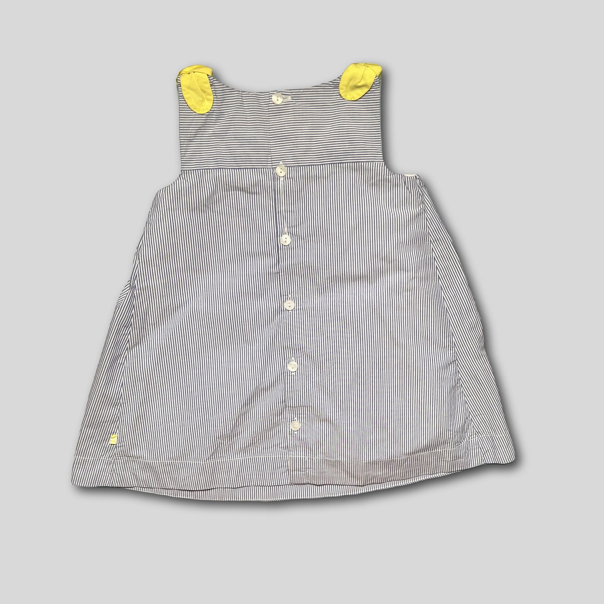 Această rochiță fermecătoare, cu dungi albastre și detalii galbene, este perfectă pentru zilele însorite. Designul său simplu, dar cochet, o face ideală pentru joacă sau pentru o plimbare în parc. Materialul este ușor și confortabil, asigurând libertate de mișcare pentru copilul tău. Detaliile galbene adaugă un strop de culoare și veselie, transformând această rochiță într-o piesă vestimentară specială. Este o opțiune excelentă pentru a aduce un zâmbet pe chipul oricui.