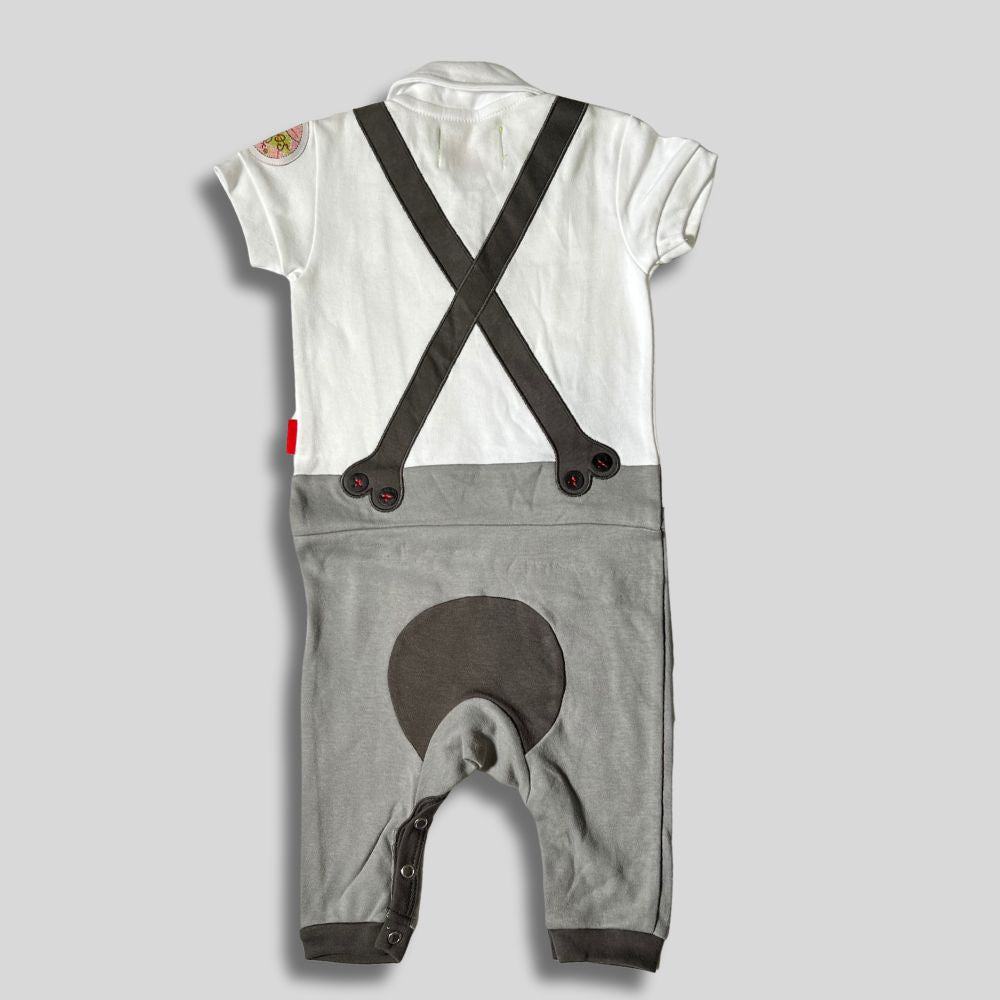 Această salopetă adorabilă, în nuanțe de alb și gri, este perfectă pentru aventurile zilnice ale copilului tău. Designul inteligent cu bretele și nasturi decorativi adaugă un plus de eleganță ținutei. Materialul moale asigură confortul necesar, iar sistemul de închidere cu capse facilitează schimbarea rapidă a scutecului. Ideală pentru joacă sau plimbări, această salopetă va face din cel mic un adevărat fashion icon.
