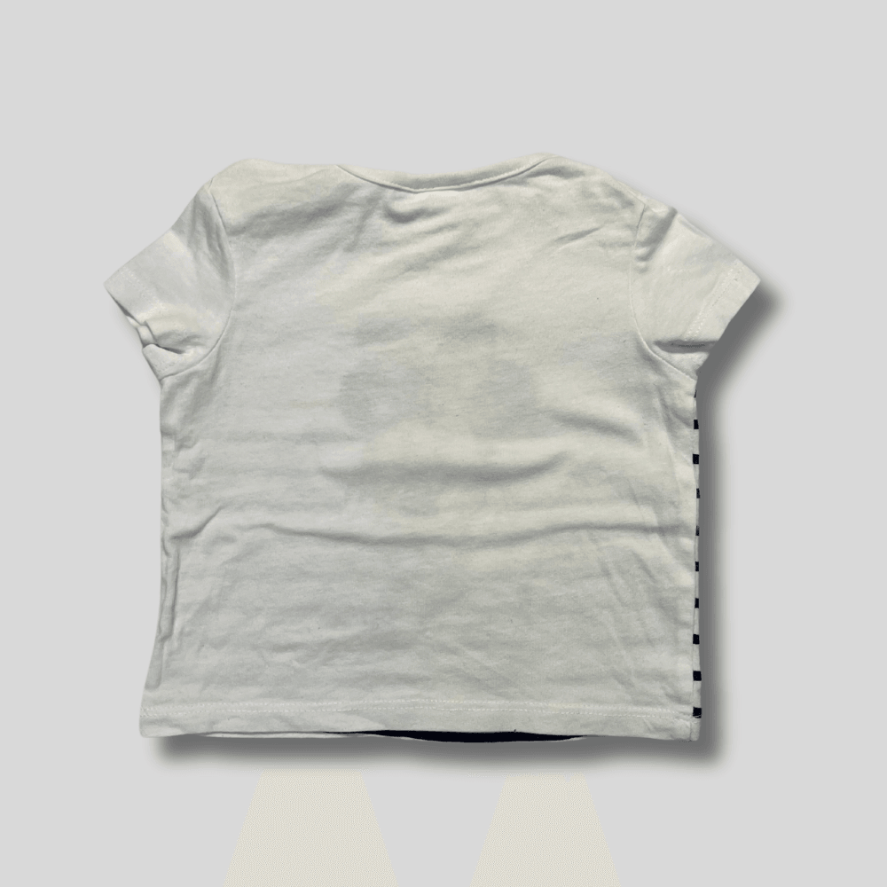 Tricou alb cu Minnie Mouse. Un tricou adorabil, perfect pentru cei mici, cu imprimeu Minnie Mouse vesel și strălucitor. Dungi alb-astru marin elegante se îmbină perfect cu imaginea Minni, având o fundiță sclipitoare roșie cu buline albe. Inscripția "Love & Fun" completează designul jucăuș. Copilul tău va adora acest tricou moale și confortabil, ideal pentru zilele pline de aventuri. O piesă vestimentară unică, revopsită cu grijă, gata să-i aducă bucurie micuțului tău.